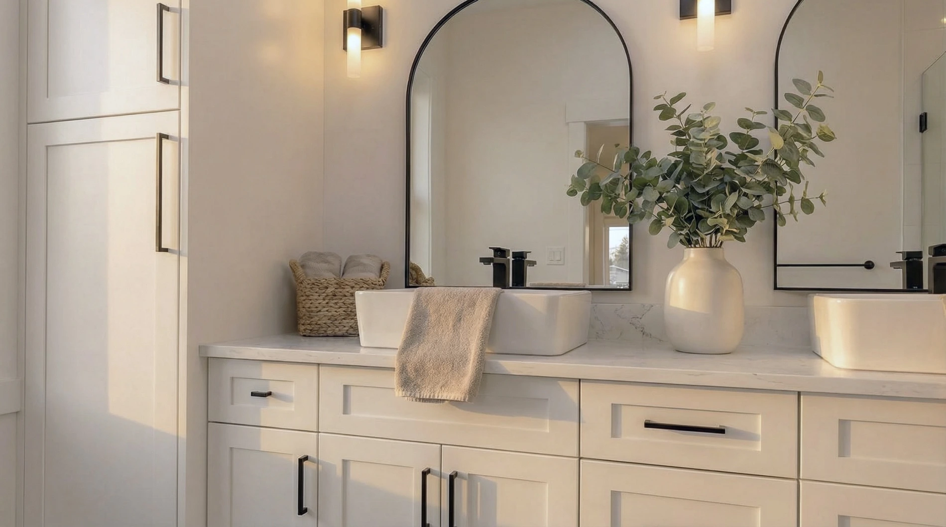 Custom shaker-style bathroom vanities topped with luxurious quartz countertops, blending timeless design with refined elegance.