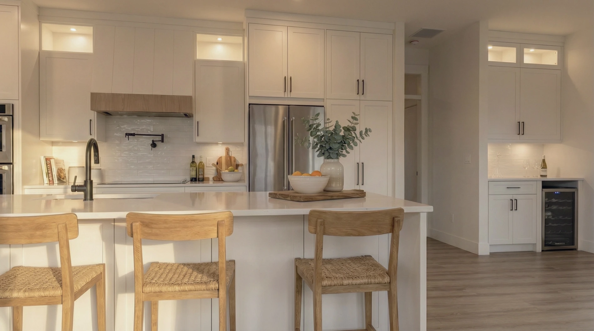 Beautiful custom shaker-style cabinetry, thoughtfully crafted by a local artisan, paired with an impressive 8-foot island—an elegant centrepiece perfect for culinary creations and sophisticated gatherings.